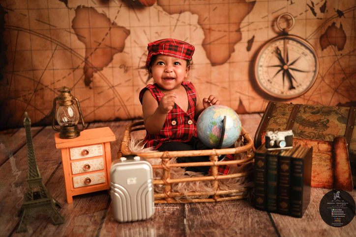 Embark on an adventure with our Explorer-themed one-year baby photo setup. Featuring mini explorer outfits, maps, and playful props, this setup captures the curiosity and adventurous spirit of your little one's first year.