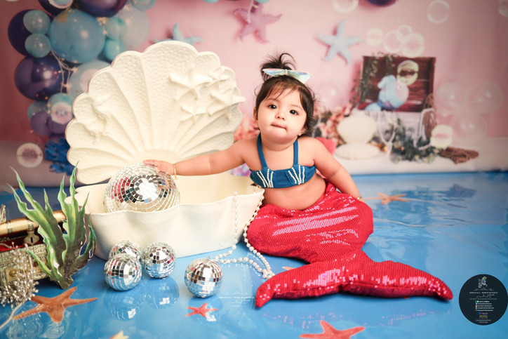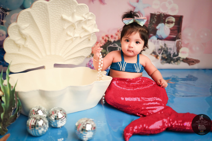 Dive into enchantment with our Little Mermaid-themed one-year baby photo setup. Featuring a magical underwater backdrop, adorable mermaid costumes, and ocean-inspired props, this setup captures the wonder and beauty of your little one's first year.